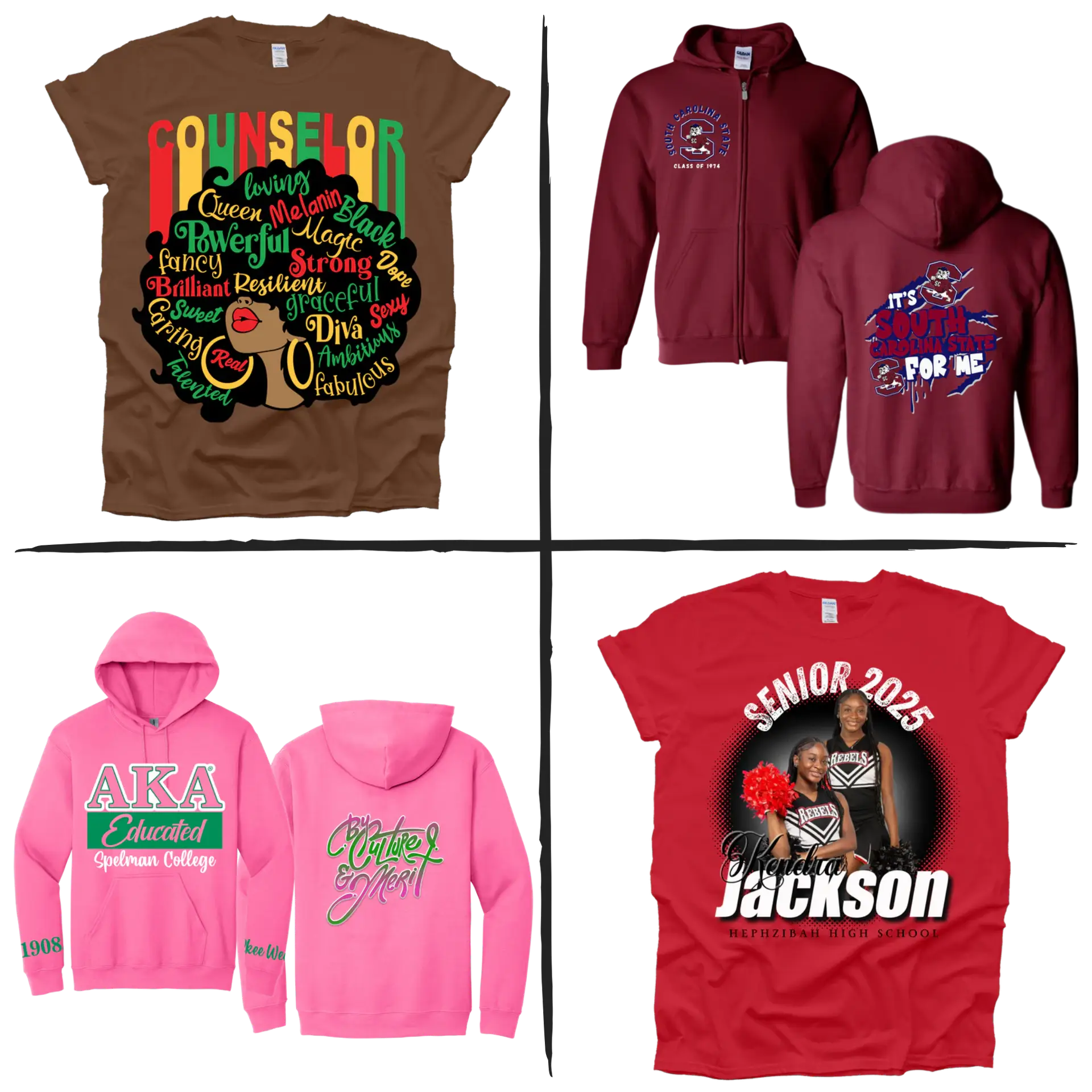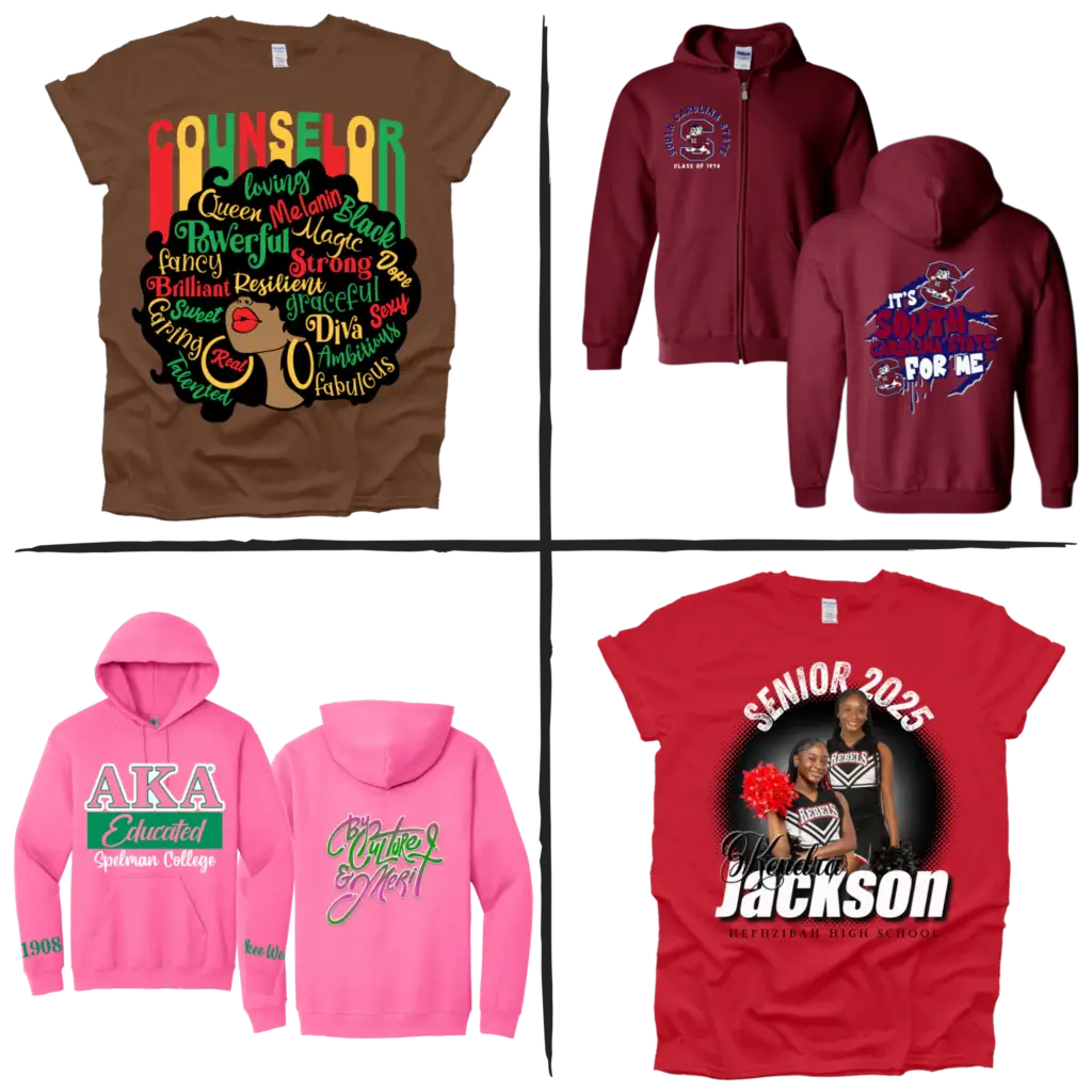 Custom prints, logos, and graphics that stand out that can be placed on t-shirts, hoodies and hooded, zippered jackets.
